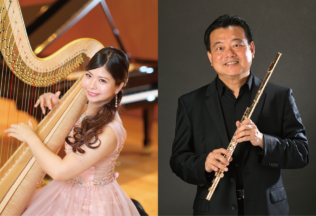 昼コン&夜コンに14年ぶりにハープが登場! カーネギーホールデビューの注目ハーピストと、名フィルで活躍中のフルーティストが共演。光り輝く音色が、アトリウムをやさしい響きで満たします。